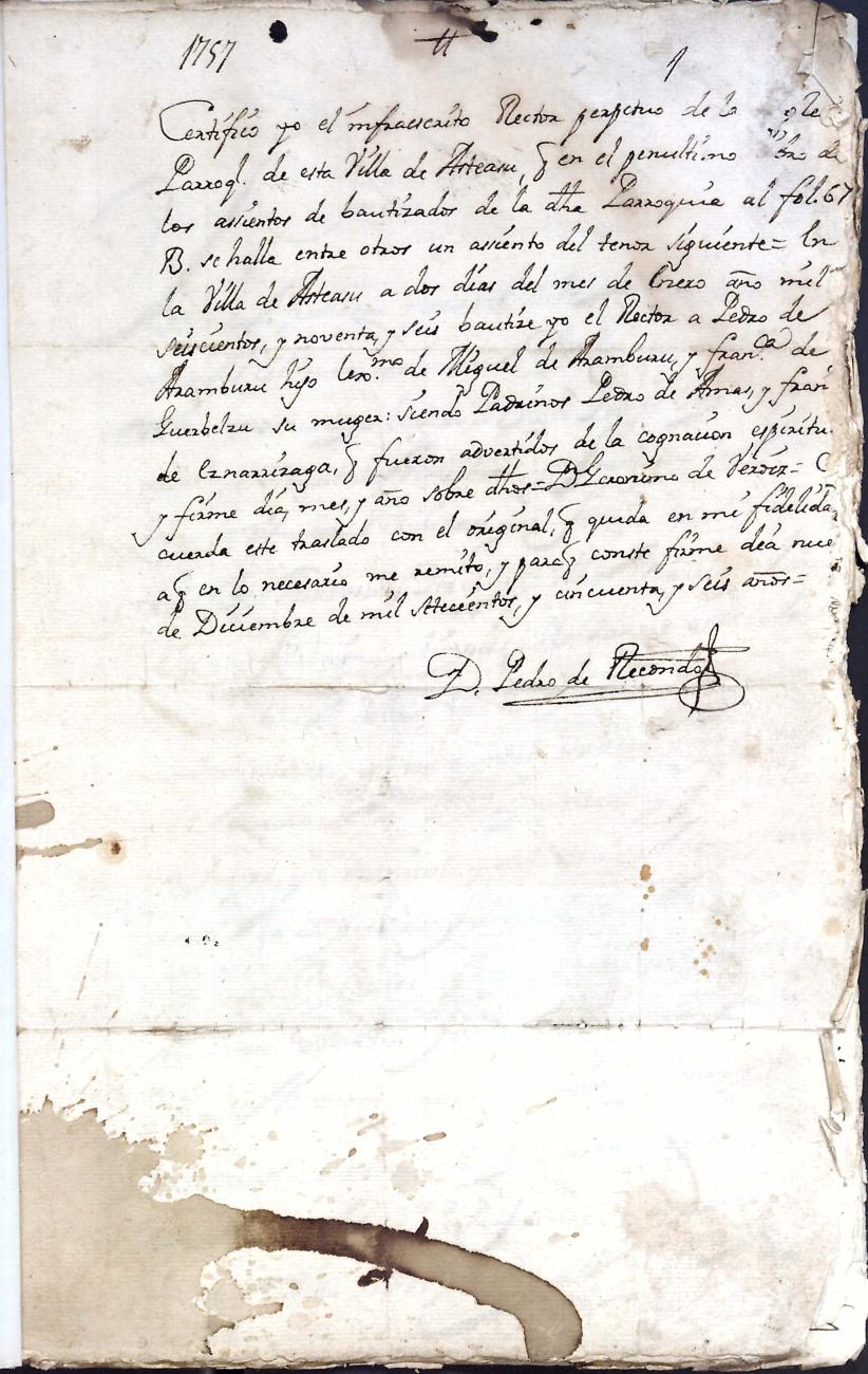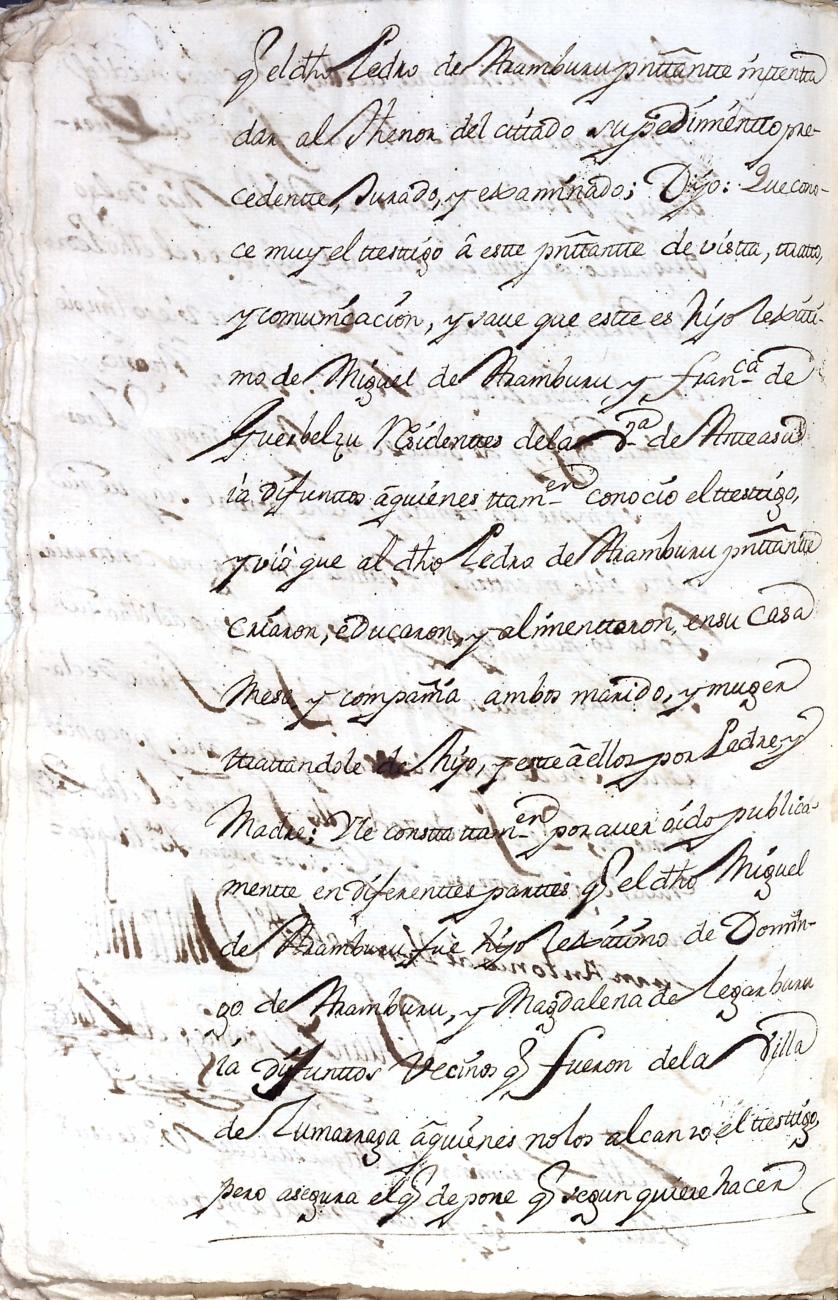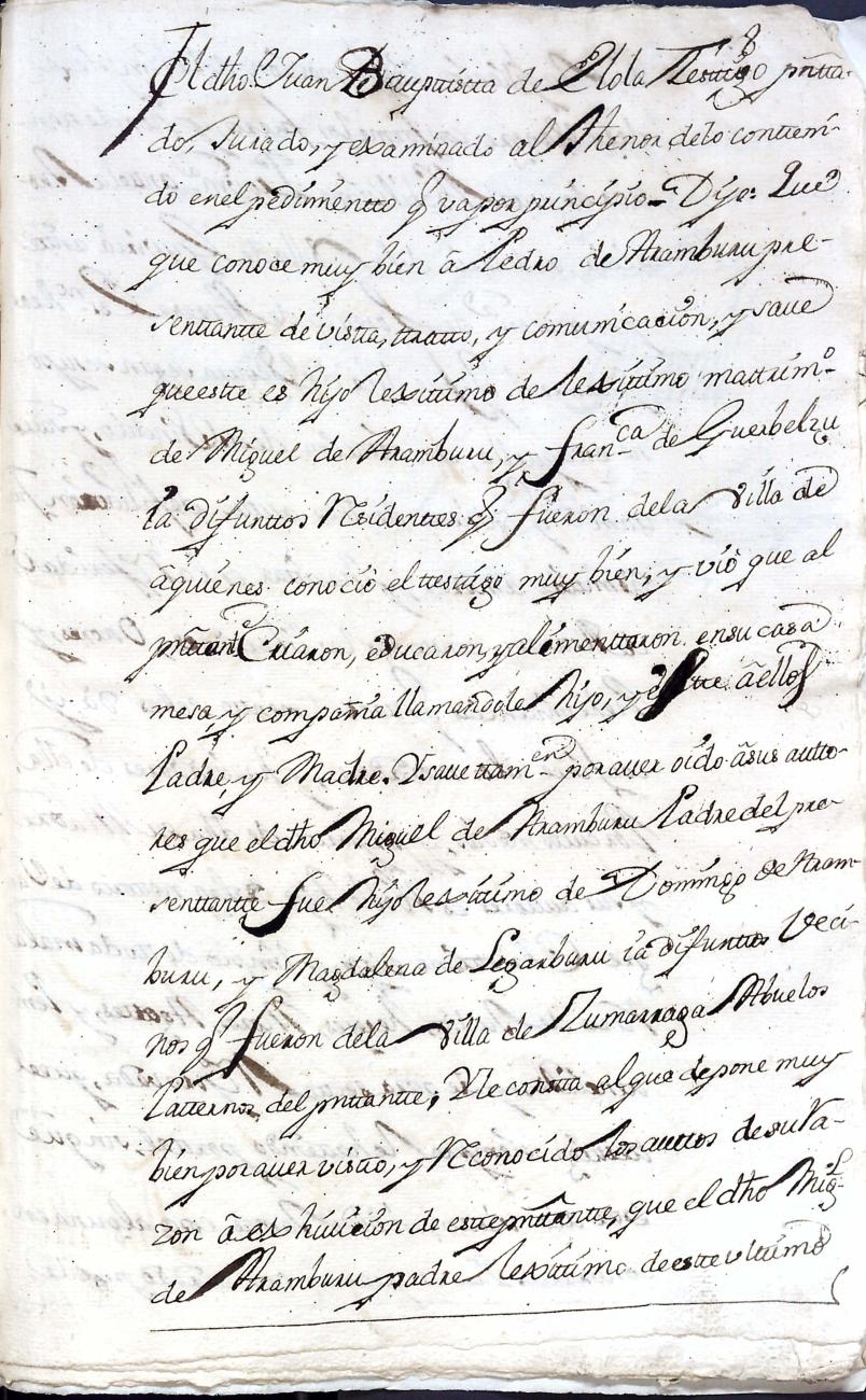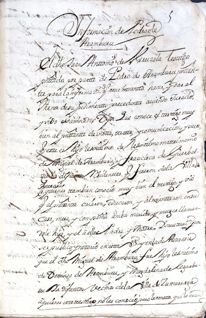 Hidalguias. Filiación de Pedro de Aramburu y Guenbelzu vecino de la villa de Asteasu.