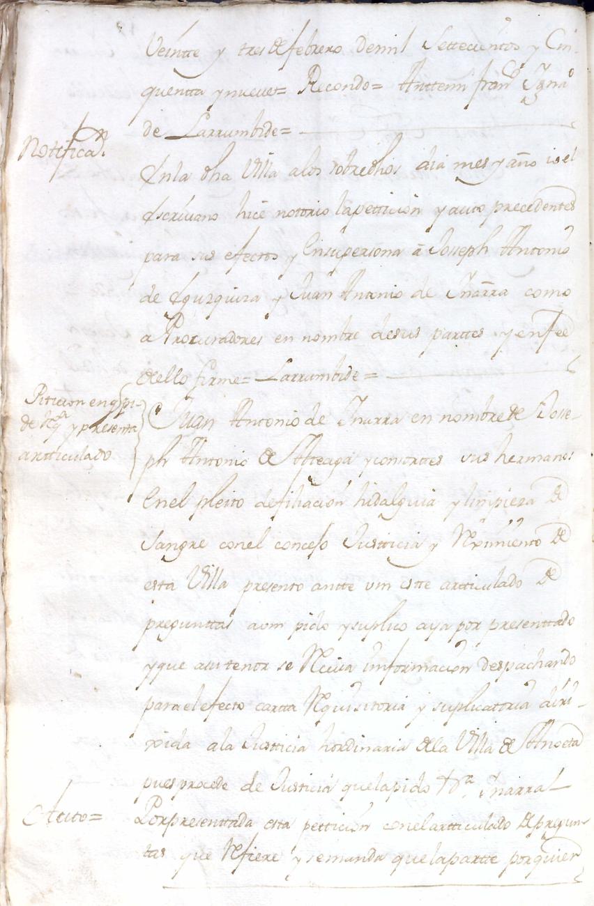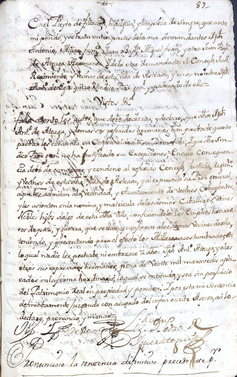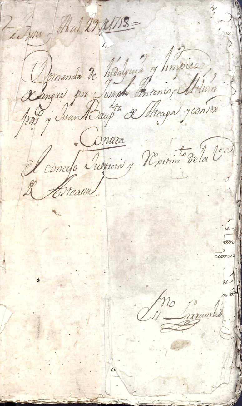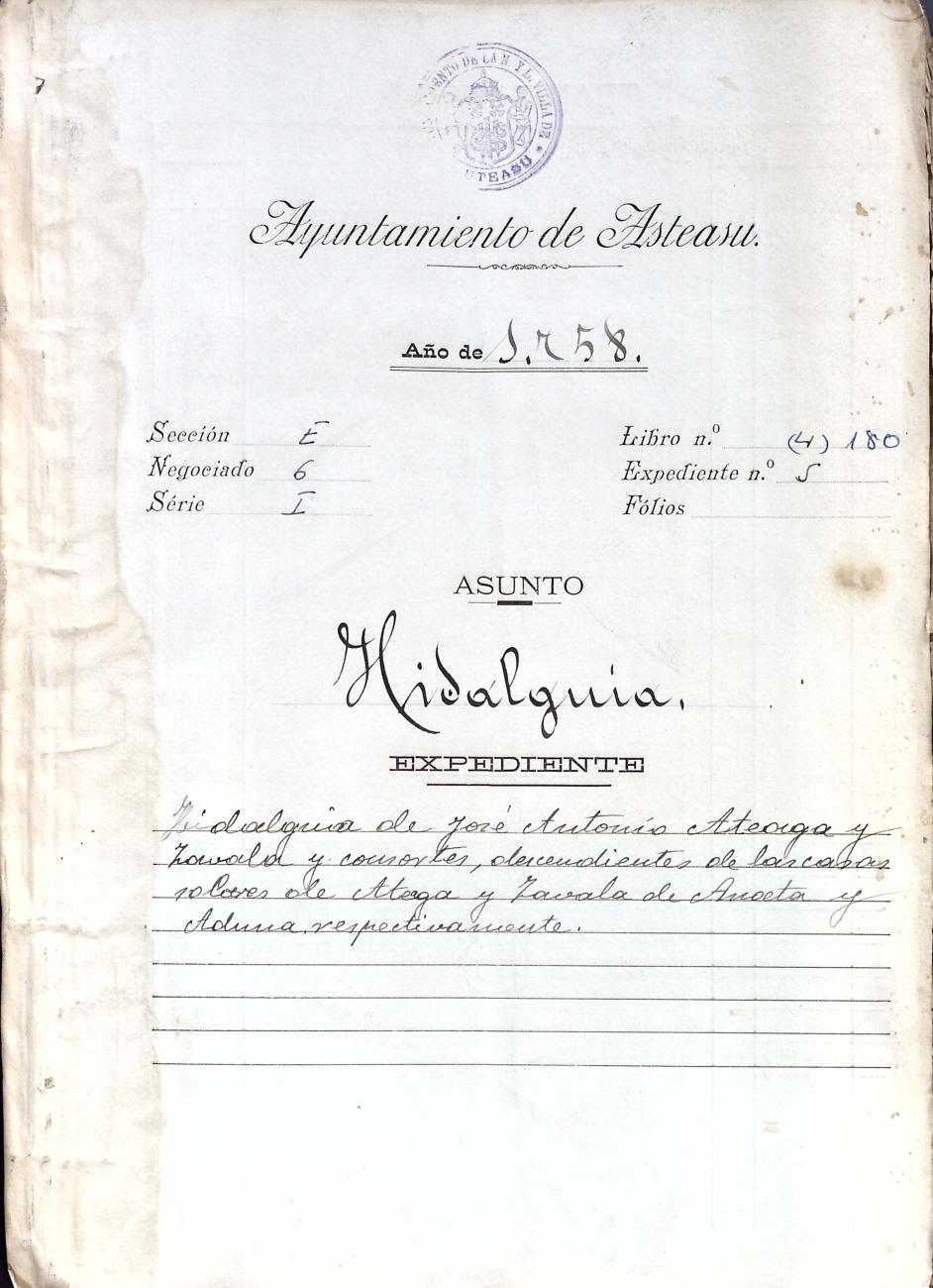 Hidalguias. Hidalguía de José Antonio de Ateaga y Zavala y consortes descendiente de las casas solares de Ateaga y Zavala de Anoeta y Aduna respectivamente.