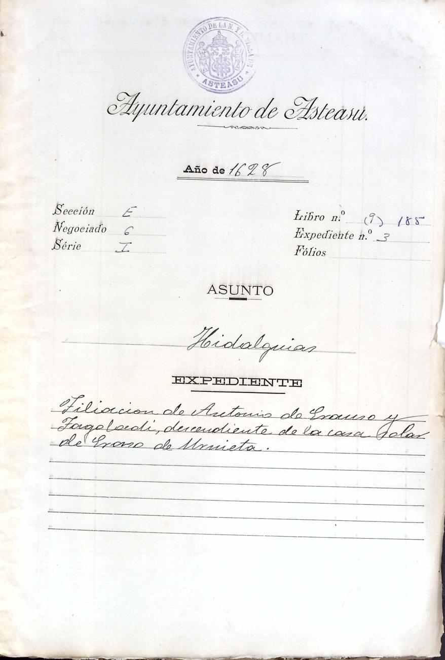Hidalguias. Filiación de Antonio de Erauso y Fagoladi, descendiente de la casa solar de Eraso de Urnieta.