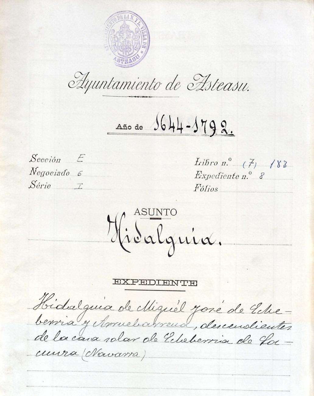 Hidalguias. Hidalguía de Miguel José de Echeberria y Arruabarrena descendiente de la casa solar de Echeberria de Lacunza (Navarra).