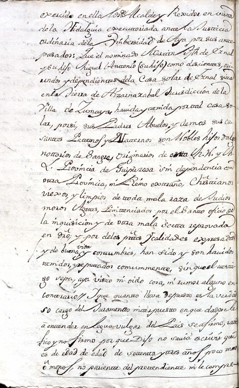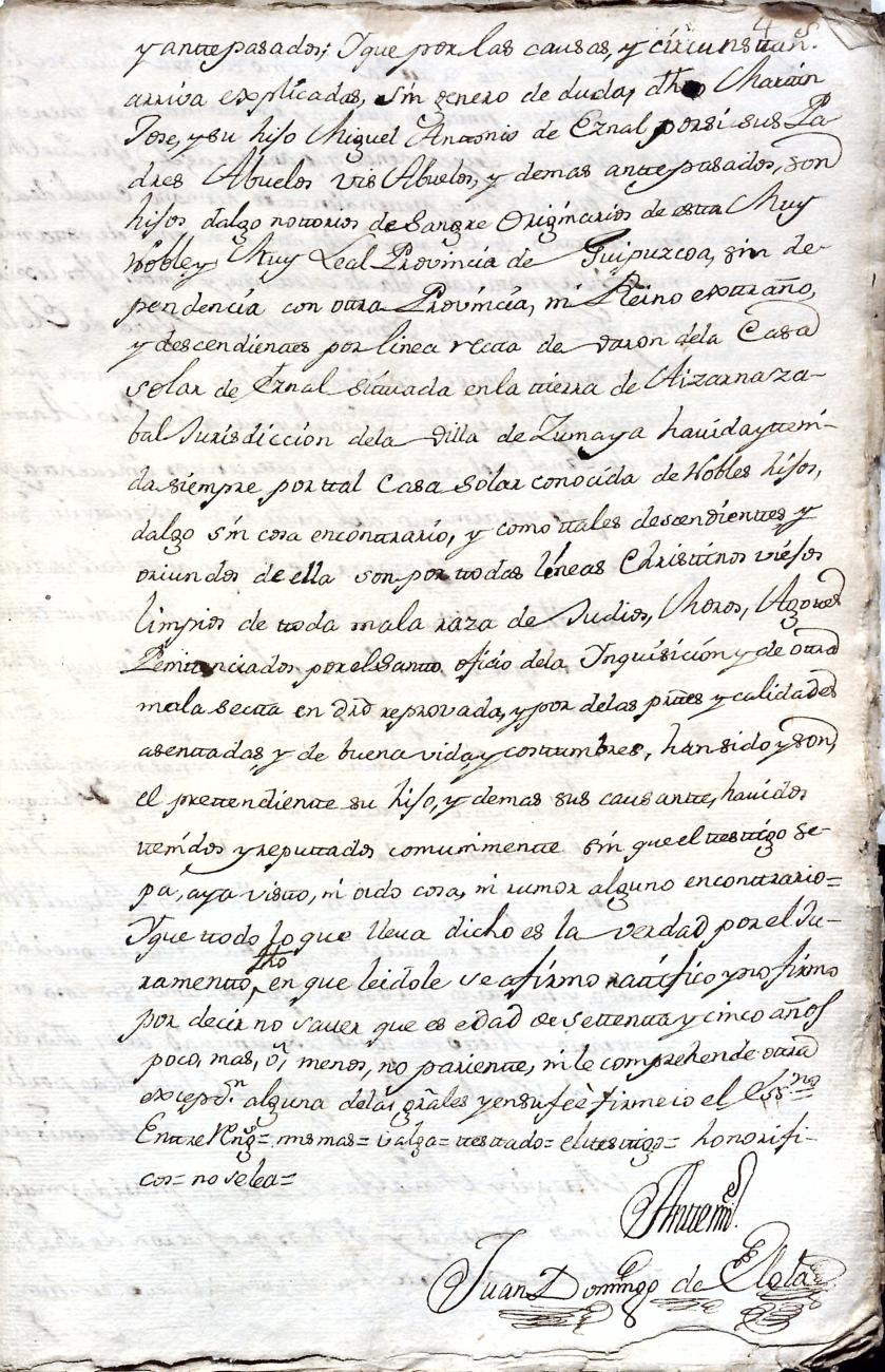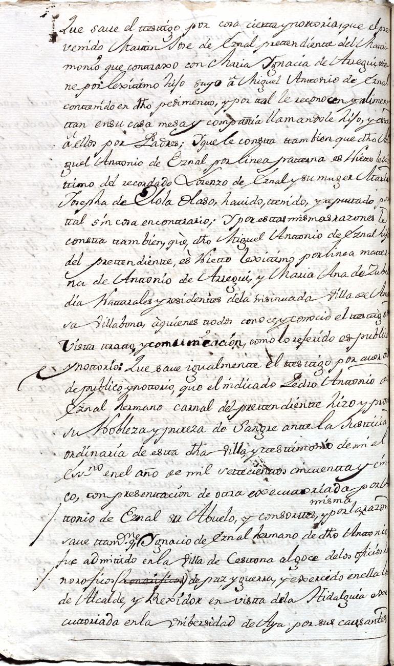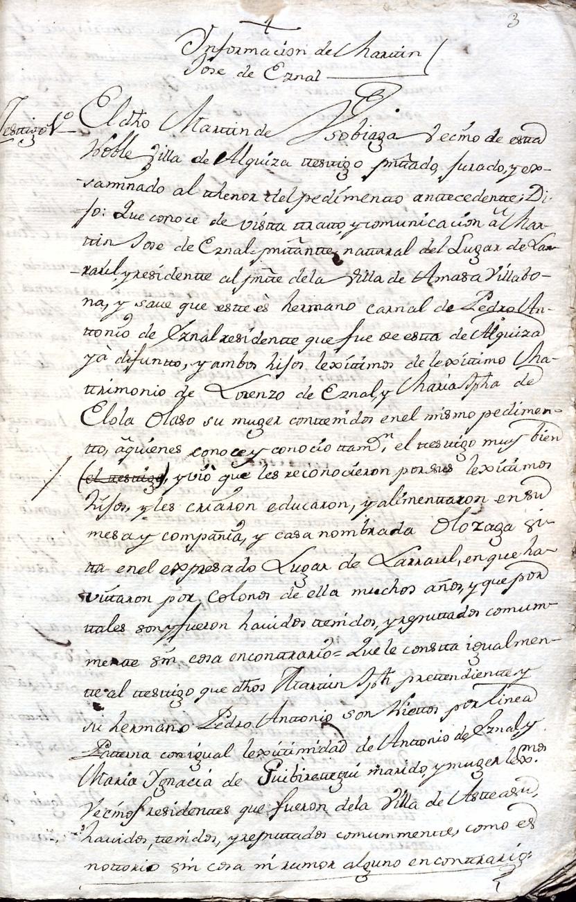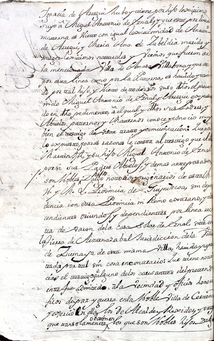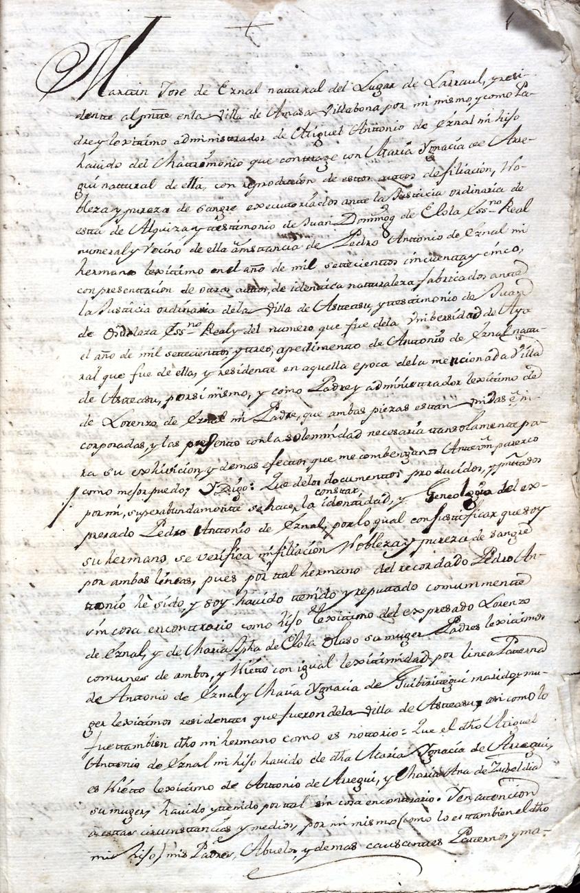 Hidalguias. Filiación de Martín José de Eznal y Elola, descendiente de la casa solar de Eznal de Aizarna.