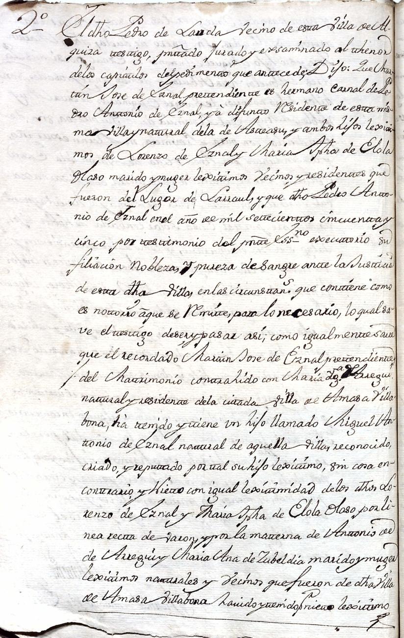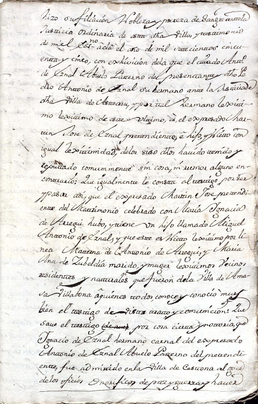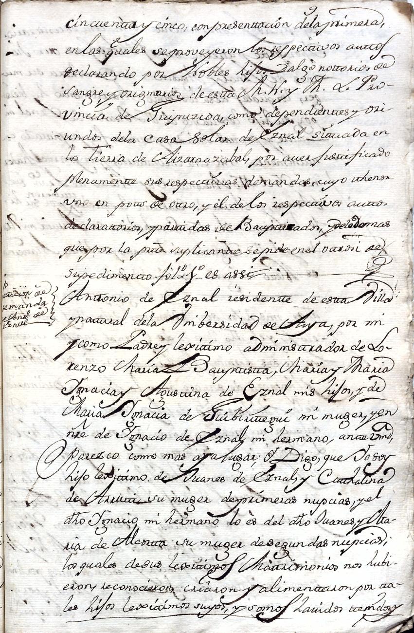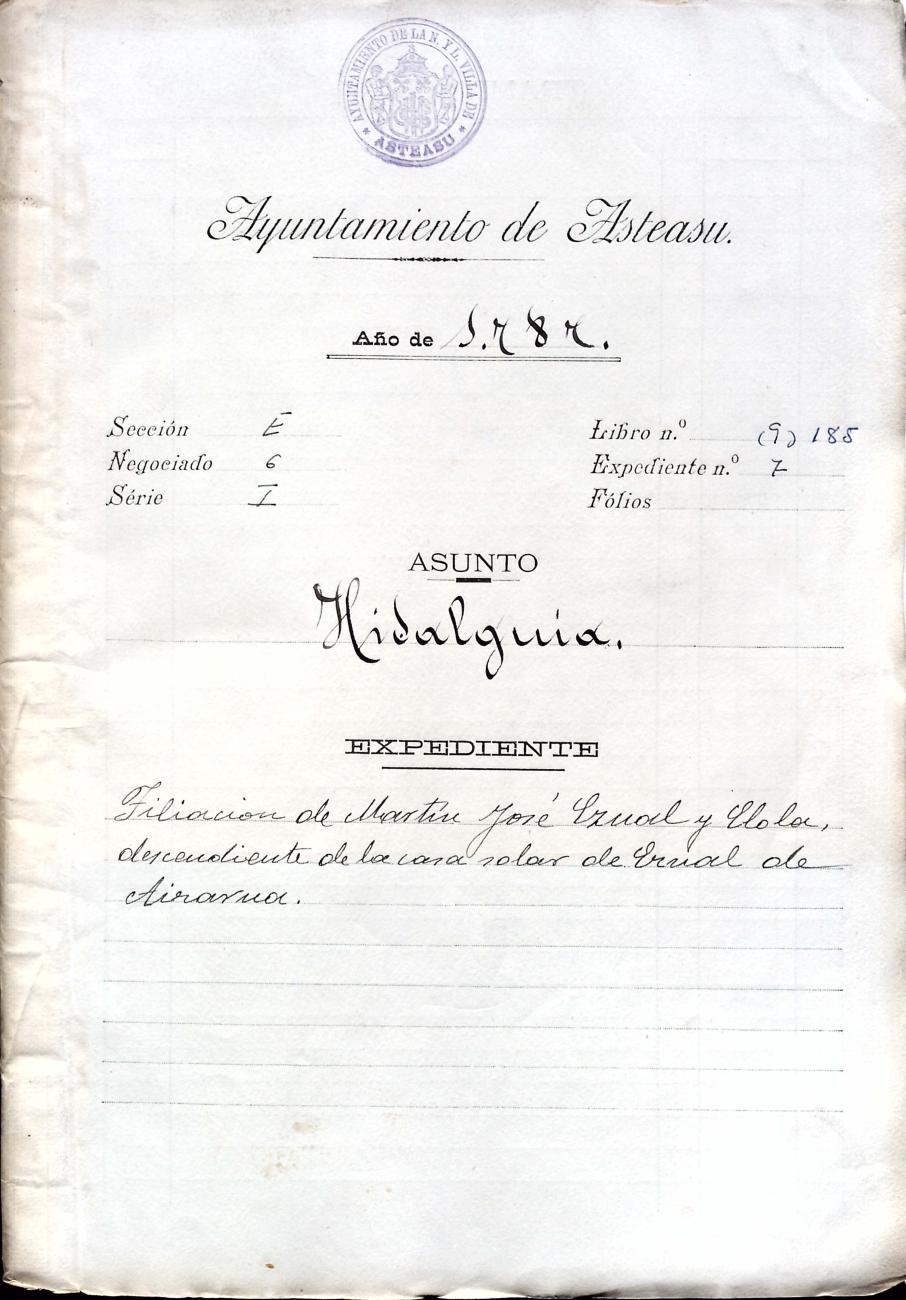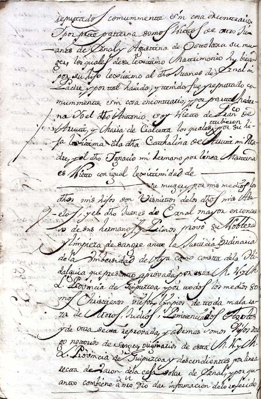 Hidalguias. Filiación de Martín José de Eznal y Elola, descendiente de la casa solar de Eznal de Aizarna.