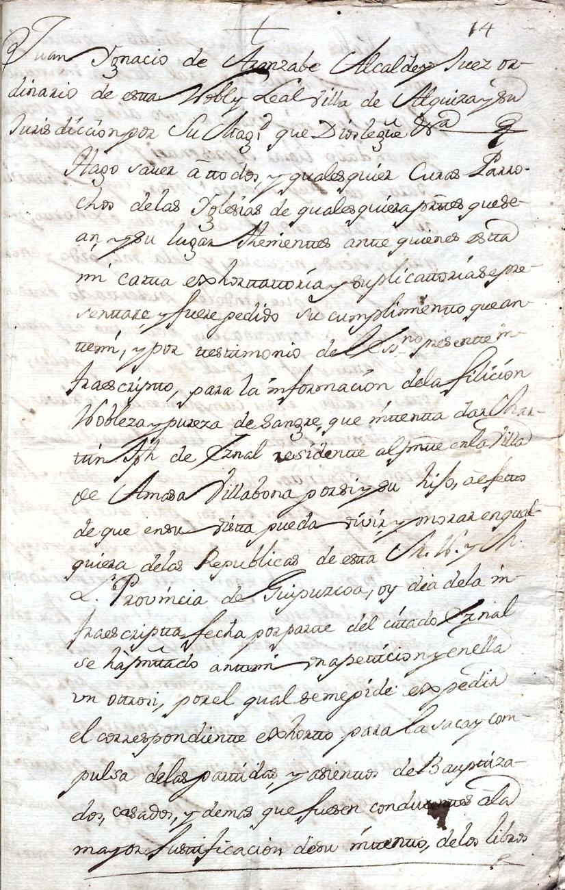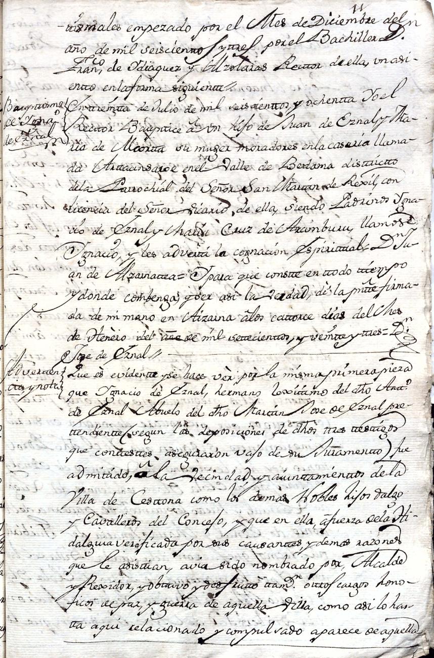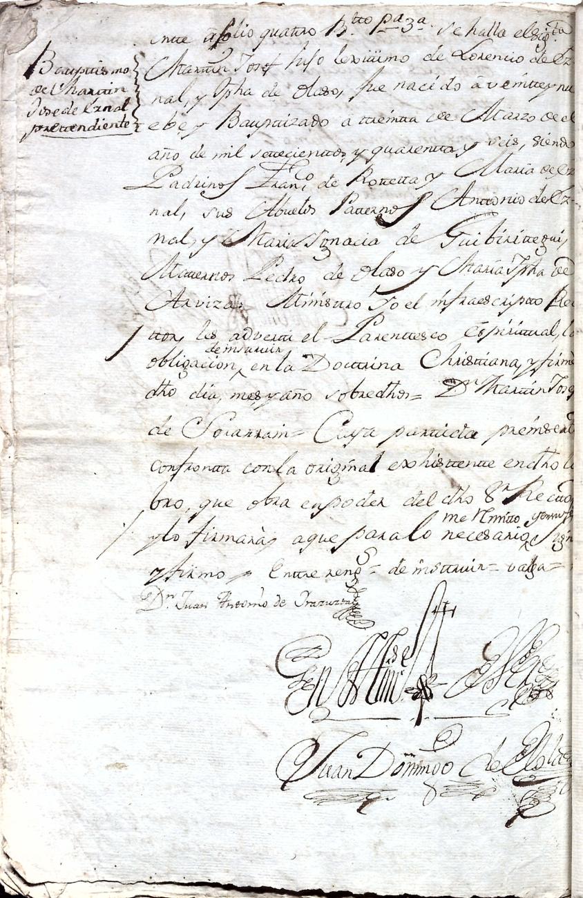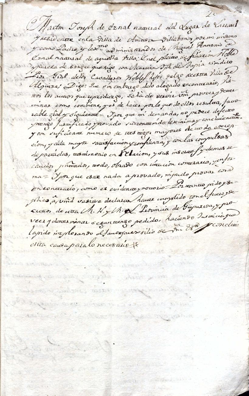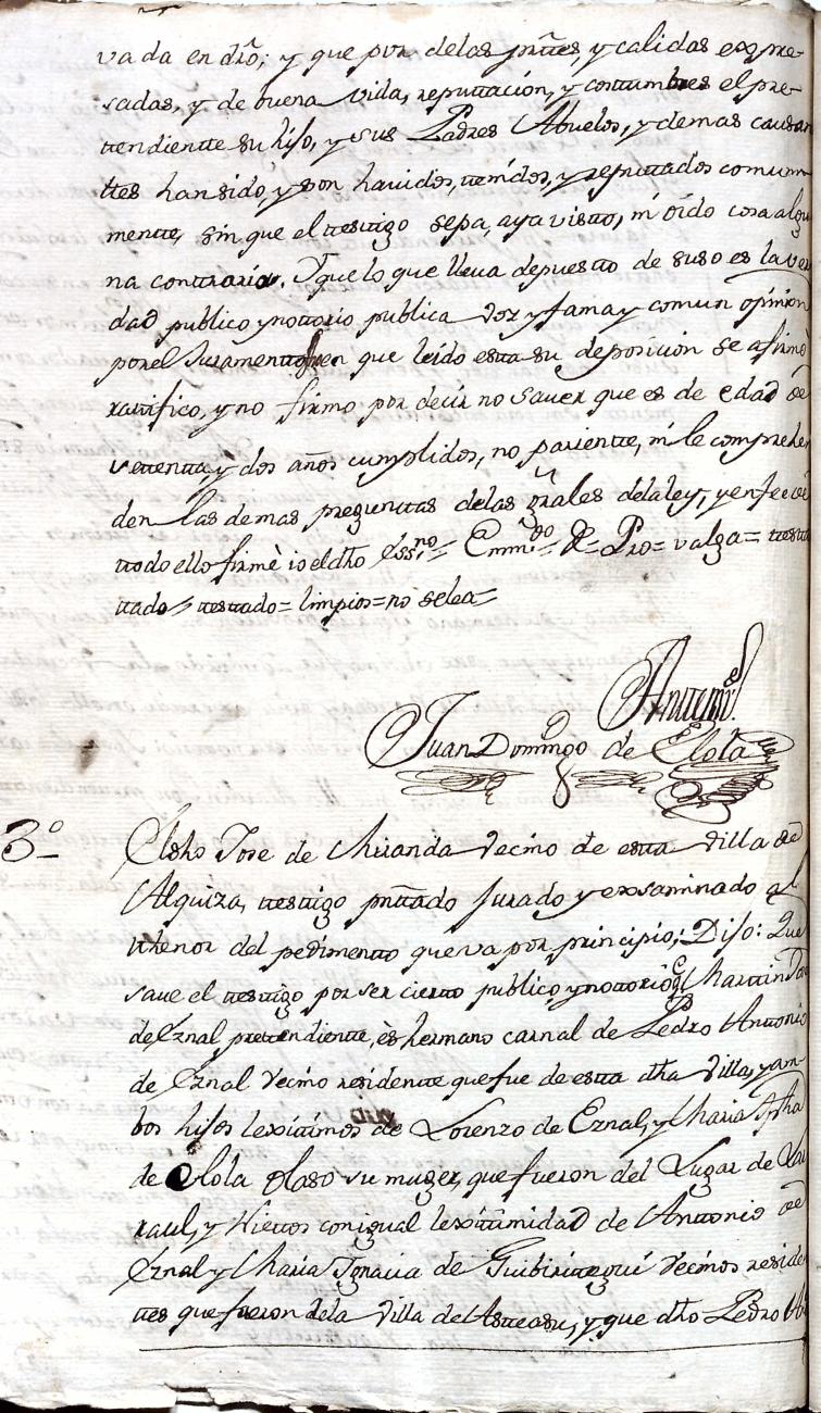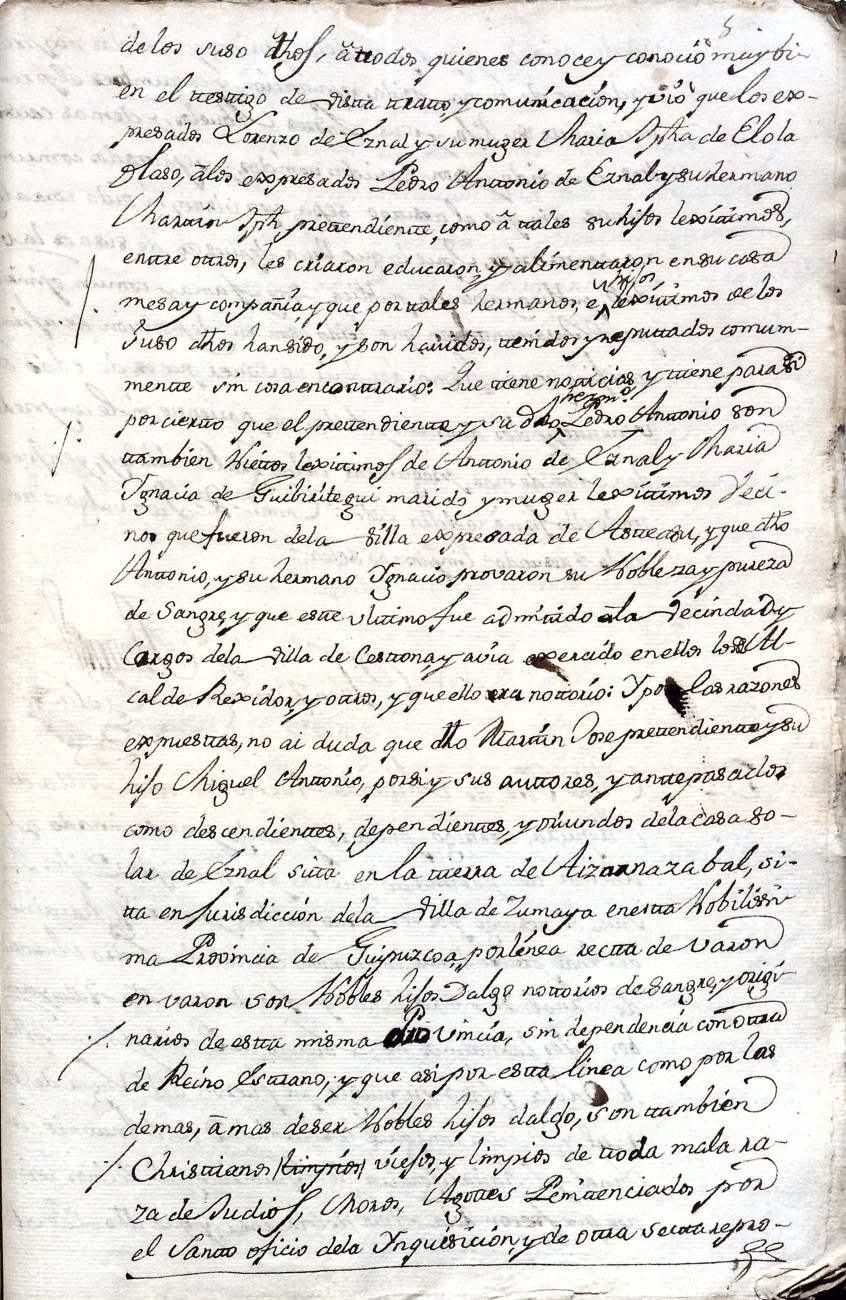 Hidalguias. Filiación de Martín José de Eznal y Elola, descendiente de la casa solar de Eznal de Aizarna.