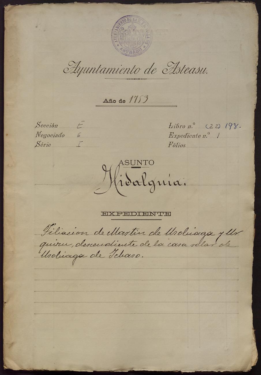 Hidalguias. Hidalguía de Martín de Usobiaga y Urquizu, descendiente de la casa solar de Usobiaga de Ichaso.